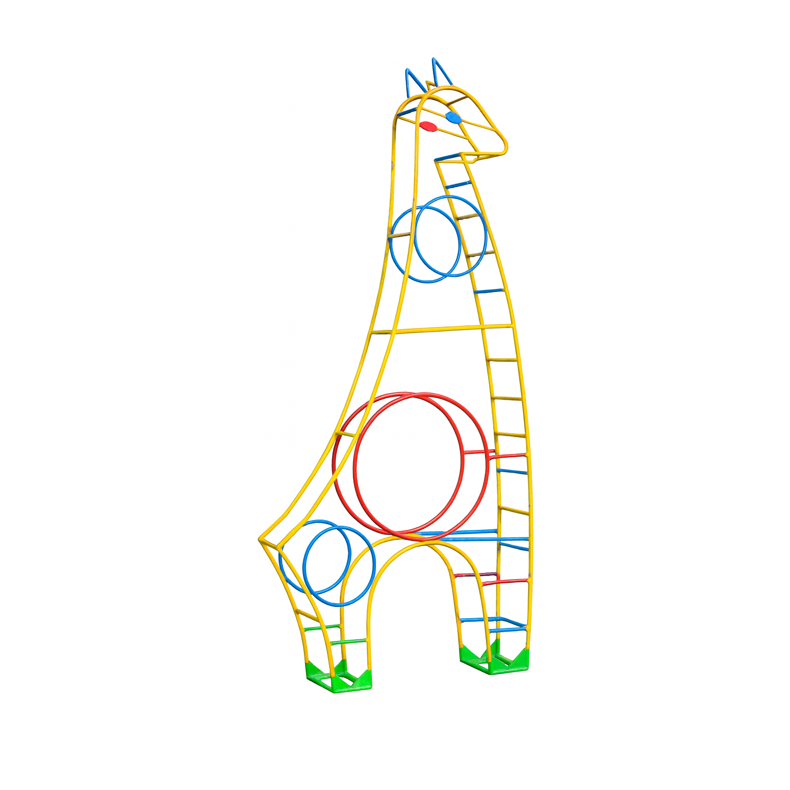 Оригинальный и яркий игровой комплекс в форме жирафа станет любимым местом для игр и занятий спортом. Конструкция совмещает элементы лестницы, колес и перекладин, что делает её универсальной для активного отдыха и развития детей.